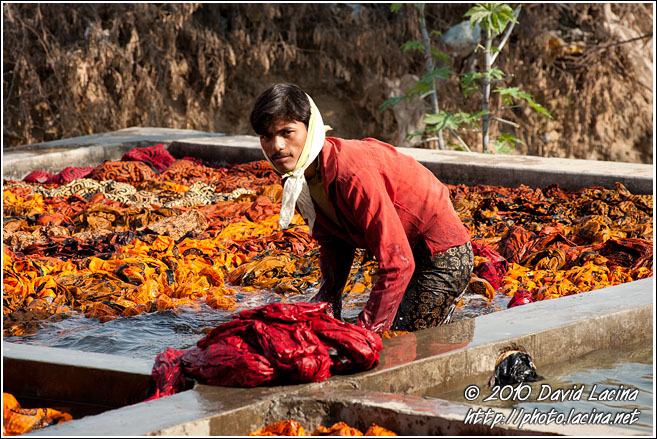 RefNum: 09in-8890. A worker in a small fabric factory near Jaipur is washing the colored clothes before they are hung on tall wooden structures.